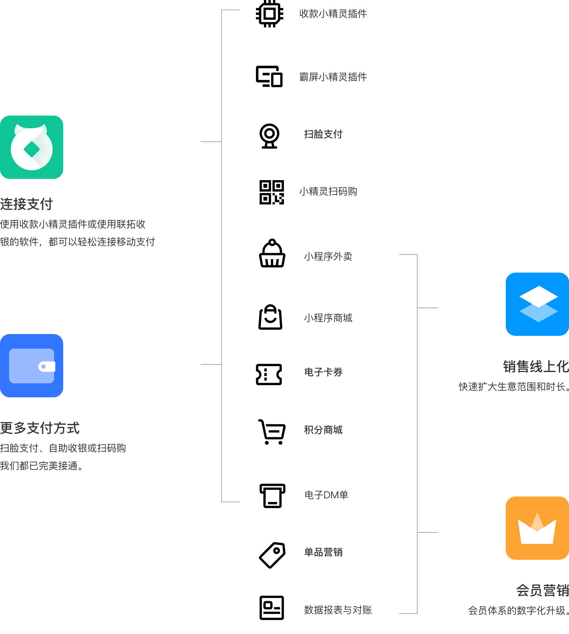 从使用收款小精灵的第一个超市至今,从社区超市到购物广场,从母婴店到药店连锁,从店内到线上,我们为零售商户提供整合的数字解决方案我们帮助传统商超便利店打通线上和线下,不仅可以快速对接您的传统收银台,还可以在门店进行小程序扫码购、自助收银等自助服务,为用户提供便捷的购物体验;同时,小精灵的小程序商城和外卖,帮助零售商家实现线上线下会员一体化,对用户进行精准触达,快速提升您的营业额。