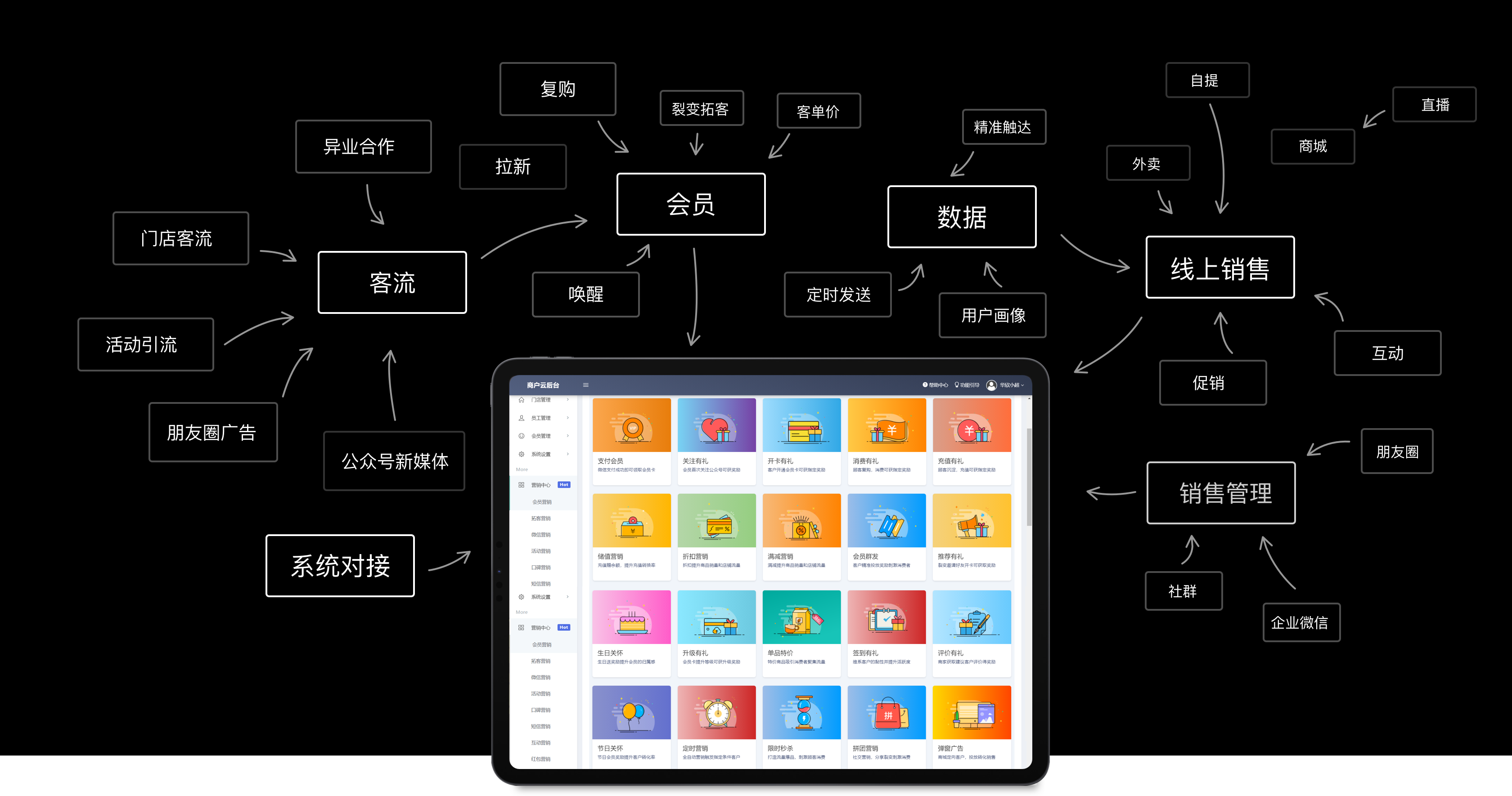 优加数科全系列的数字商业产品可以灵活运用在各种行业,通过一张电子会员卡可以轻松整合线下流量,我们的后台管理系统可以很简便地建立适合您自己业务的会员体系。